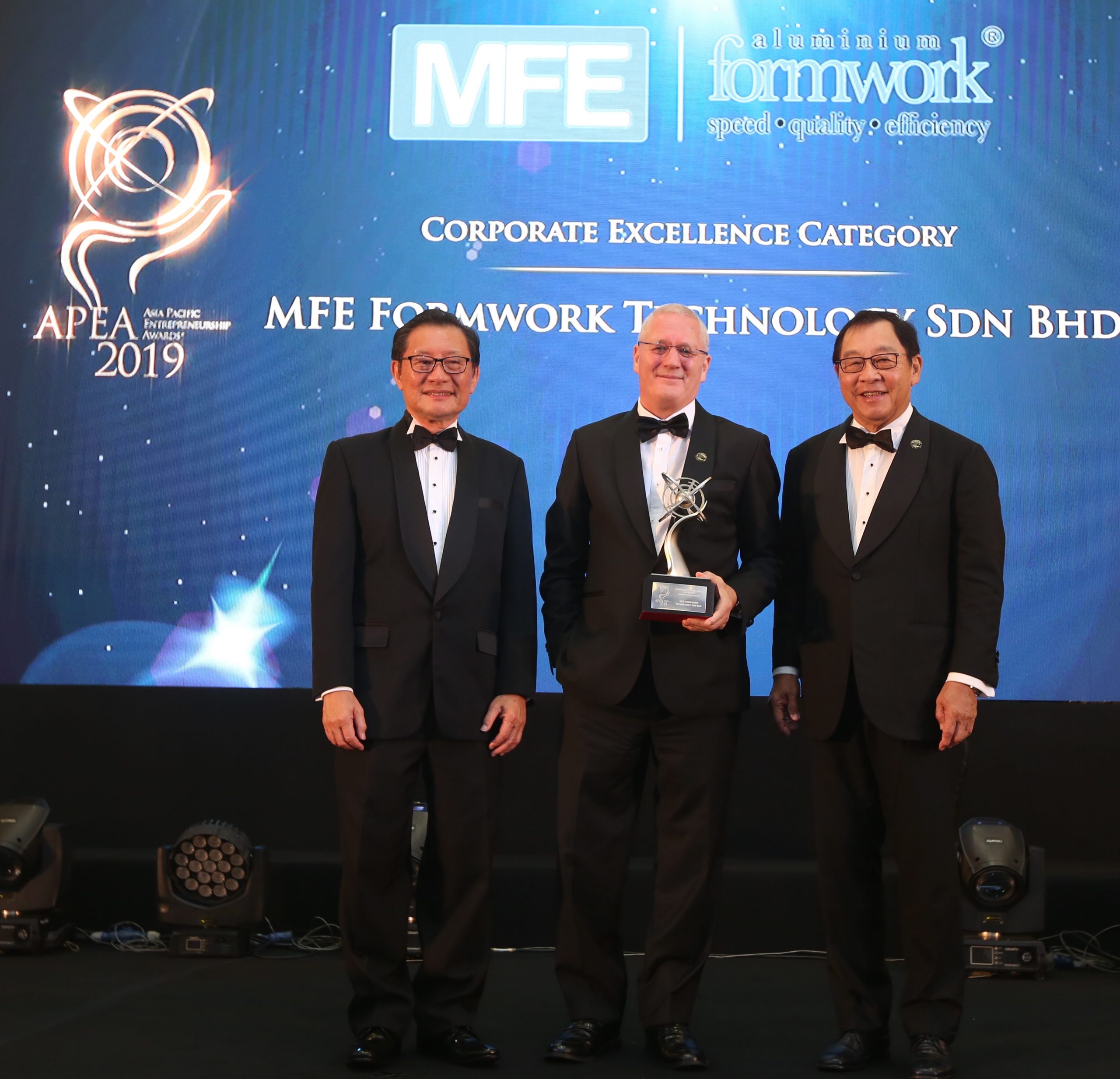 MFE Formwork Technology was presented with a Corporate Excellence Award in the manufacturing sector at the 10th annual Asia Pacific Entrepreneurship Awards ceremony held at the Intercontinental Hotel in Kuala Lumpur on the 6th September 2019.